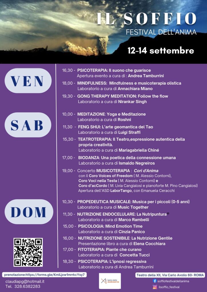 A Roma, in zona Spinaceto, ospitata dal Teatro comunale della XII, si terrà edizione del Festival dell’Anima “IL SOFFIO”, che vedrà un susseguirsi di laboratori e di esperienze olistiche.