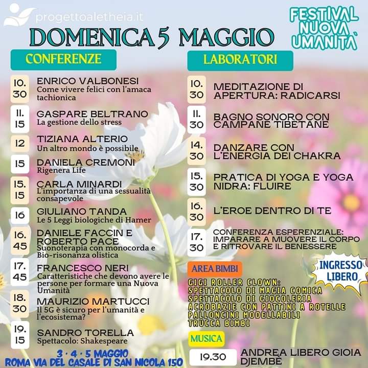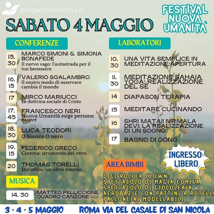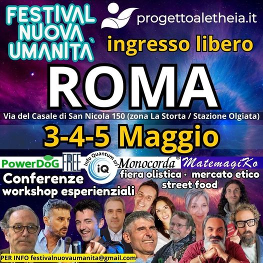 Nell’ambito del Progetto Aletheia www.progettoaletheia.it si svolgerà a Roma in zona La Storta-Olgiata il FESTIVAL NUOVA UMANITA’, con decine di conferenze e workshop esperienziali, accompagnati in una visione olistica da una fiera e mercato etico, street food.